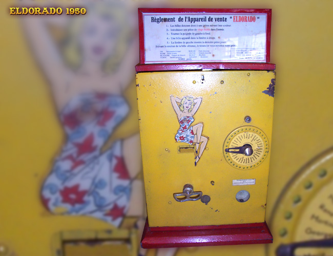 ELDORADO around 1950 from Belgium, game from the bar. You put in a coin, turn handle and it depends on the colour of the wheel to know if you win a chocolate, gum, biscuit or more