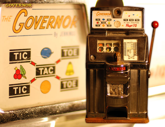 Governor slot machine, owned by Brigitte Bardot, and used by her husband, still containing franc coins. This machine has a photo of her on the front and her autography on the left side.