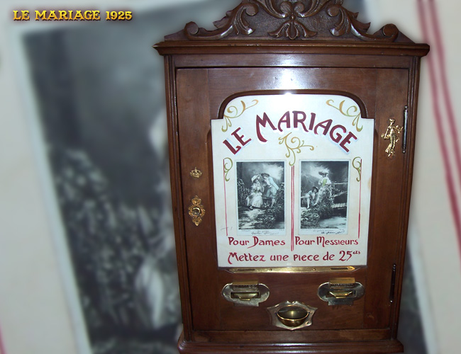 Le MARIAGE 1925 rare french horoscope machine from A. Braesch constructor, excellent condition whith old cartons inside for ladies and gentlemen. For the mariage machine, it's simple : one entry of coin for ladies, one for men then you draw a lever and falls a small horoscope in cartoon ( originals not reproduction.... 12 different for men and around 40 for ladies, see pictures ) one is a picture of the face of a person you'll meet, the one other the text of horoscope.