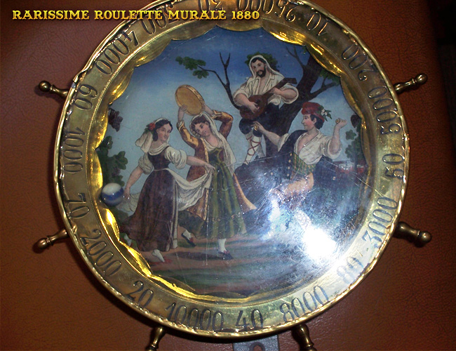 RARISSIME ROULETTE MURALE 1880 , it's a lottery to fix on the wall, these roulettes were in bars in the port for marines. It's French, this is the big model ( diamètre 23 cms ), with antic painting under the glass...