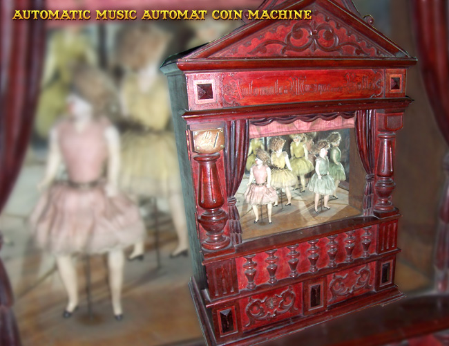 Automatic Music Automat coin machine ( Germany 1898 ) 3 dancers , very rare. It is 90 x 58 x 35 cms dimension with on air of classic music, these sort of machine was for Switzerland, each train station had one in the hall.