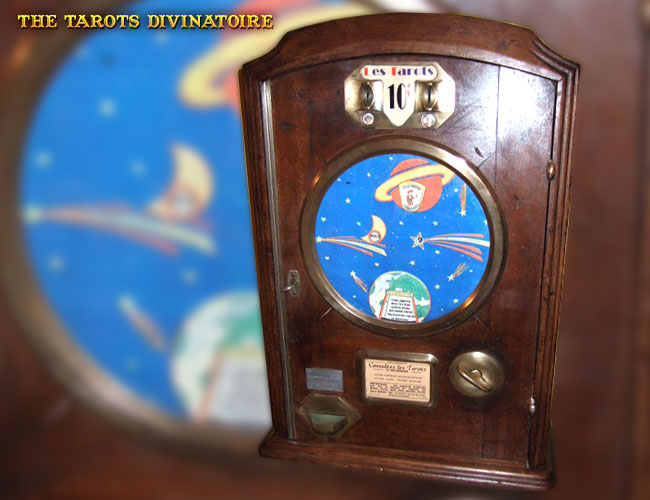 The TAROTS divinatoire is a gambling machine, two entrées for coins ( one for ladies, one for men ) then you turn the handle and the disc turns in the sky and comets, when it stops you can read your kucky day in the week, your favorite number, your card of tarot and read your horoscop of near future. If you fall on red card you win a coin. It's a funny, decorative and rare machine of fairground 1930.